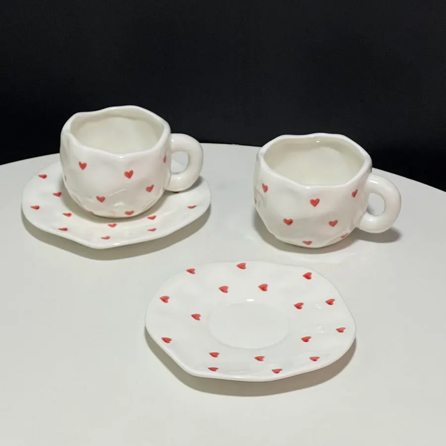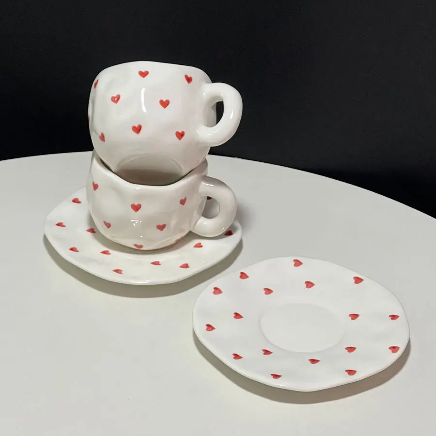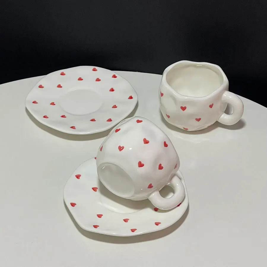 Cute Hand Pinch Irregular Painted Small Red Love Coffee Cup Plate Underglaze Ceramic Afternoon Tea Cup Plate Set