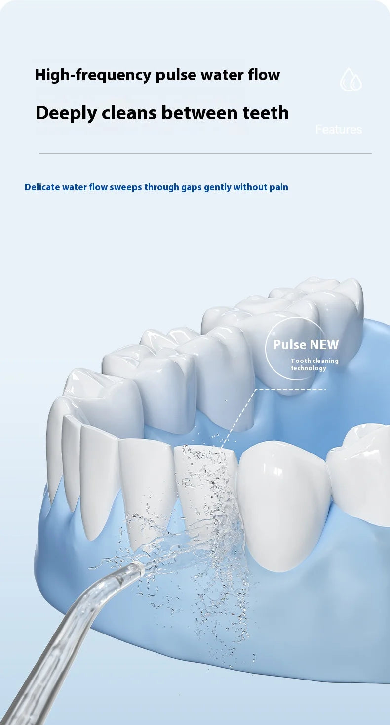 High-frequency pulse water flow removes 99.9% of plaque from teeth gaps and gumlines