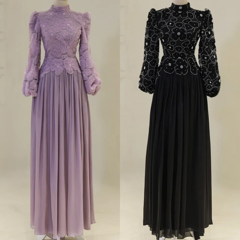 Fashion Chiffon Handmade Flower Beading Straight High Collar Long Dresses Bespoke Occasion Dresses Retro