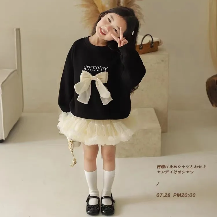 Girls' Bow Long Sleeve Round Neck T-Shirt - Sweet Casual Fall Winter Top for Toddler Kids Autumn Fashion