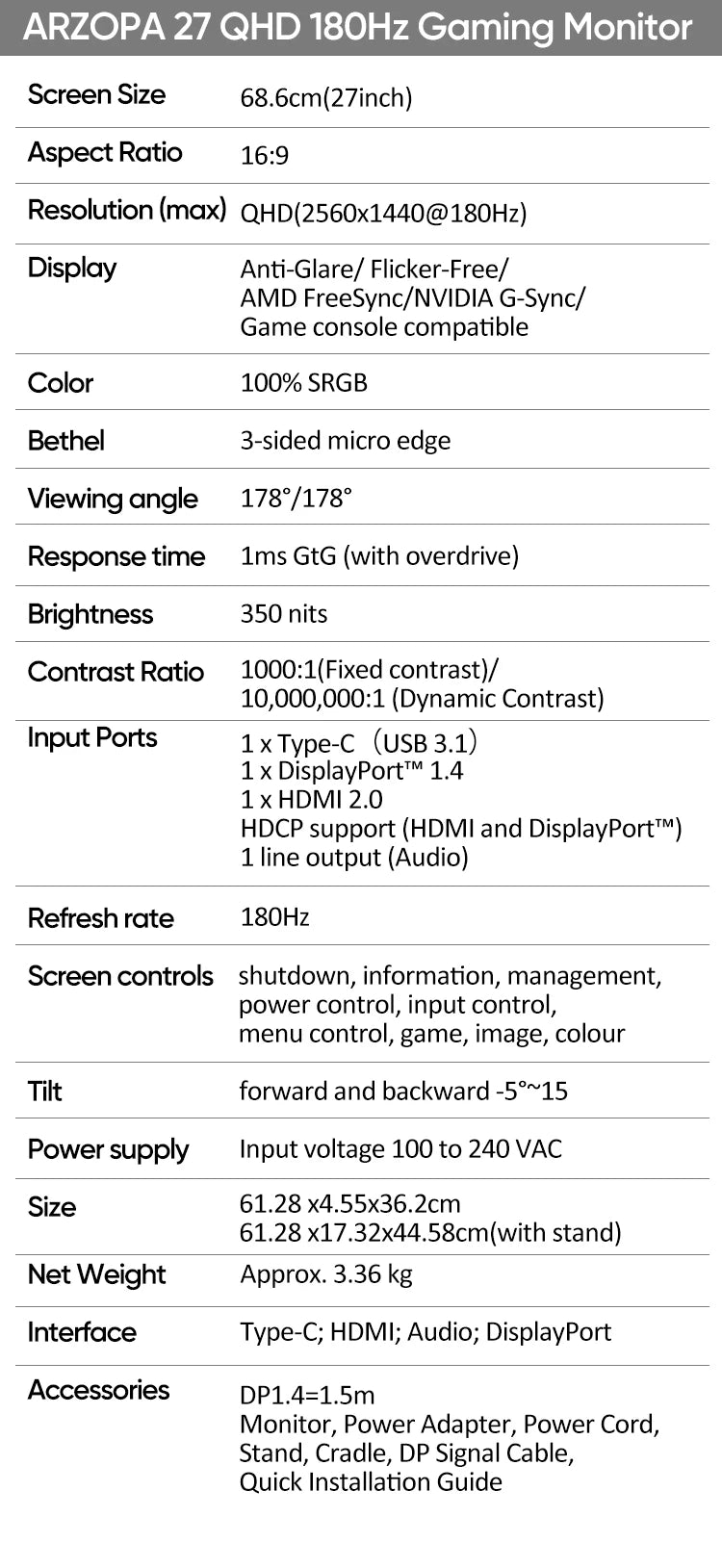 New ARZOPA 27inch 180Hz 2K FastIPS QHD PC Monitor 1ms FreeSync Gaming monitor,M1RC