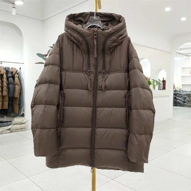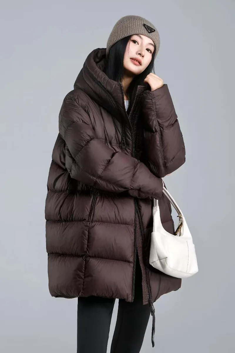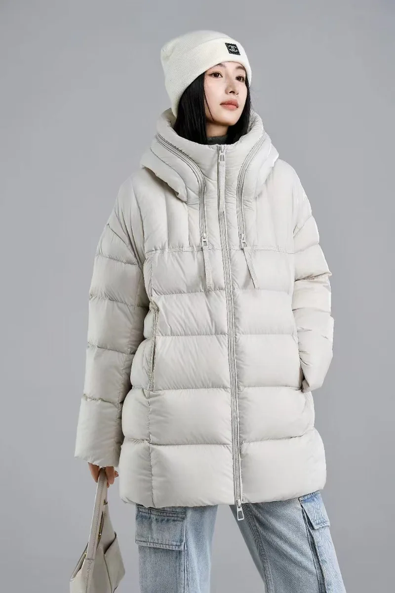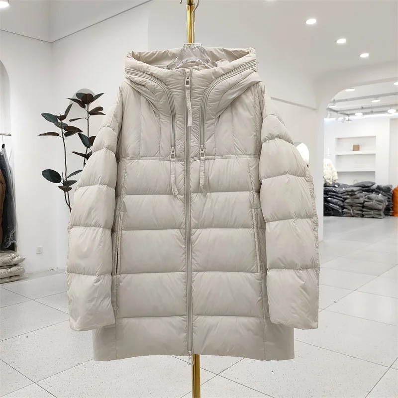 Winter Hooded Warm Mid Length Down Jacket Female Double Zipper Solid Parker Outwears Women 90% White Duck Down Loose Down Jacket