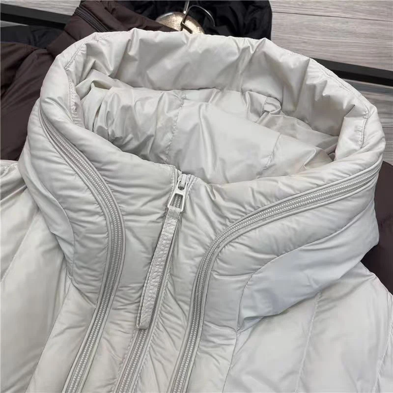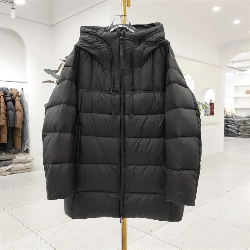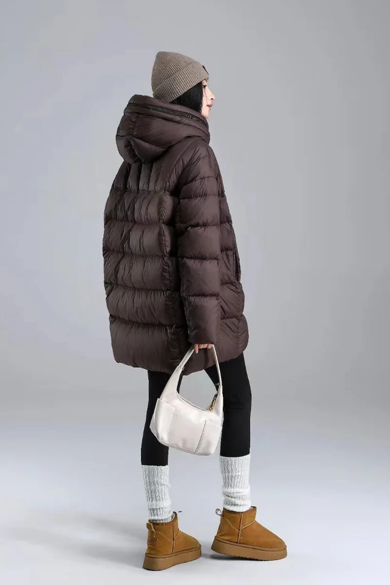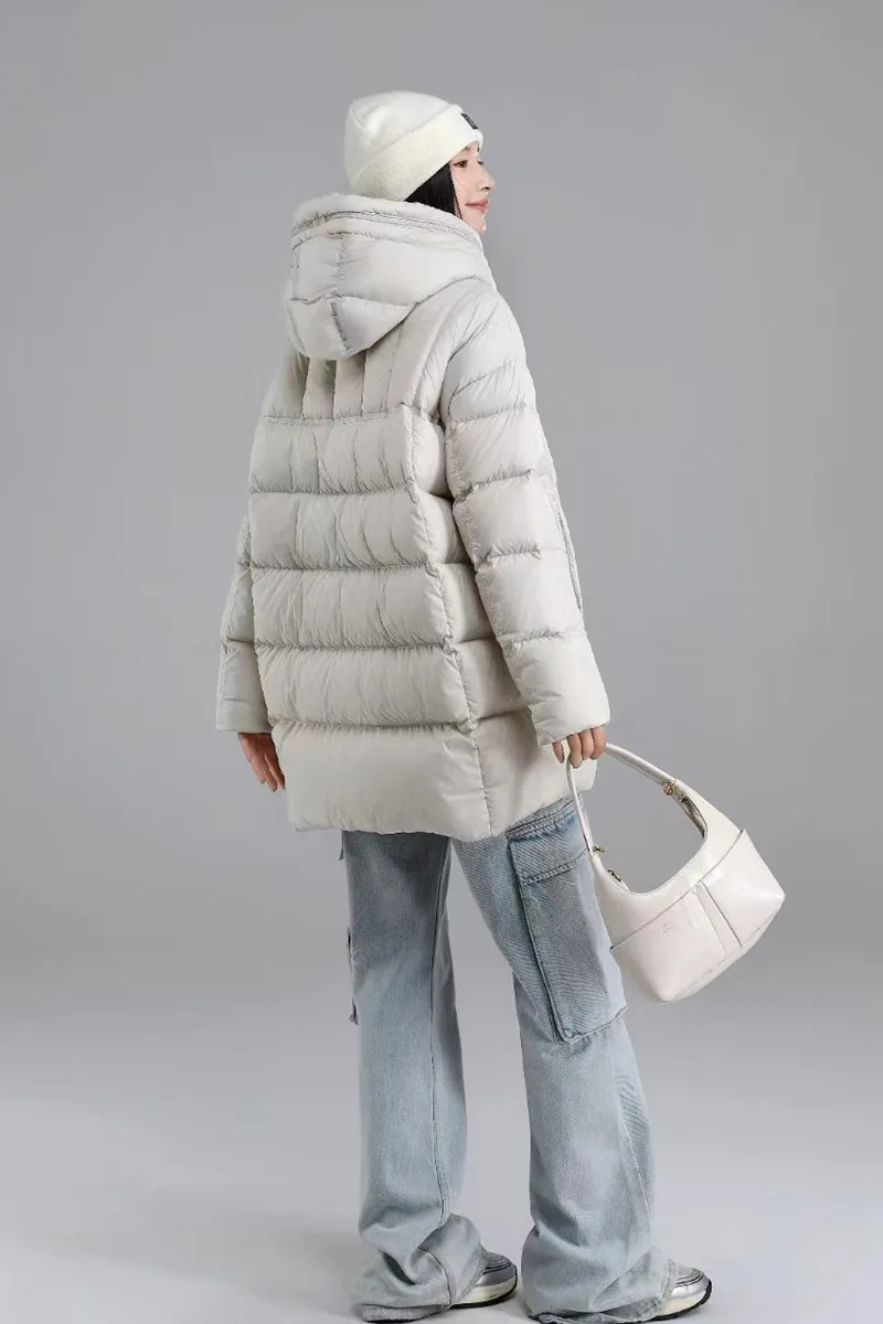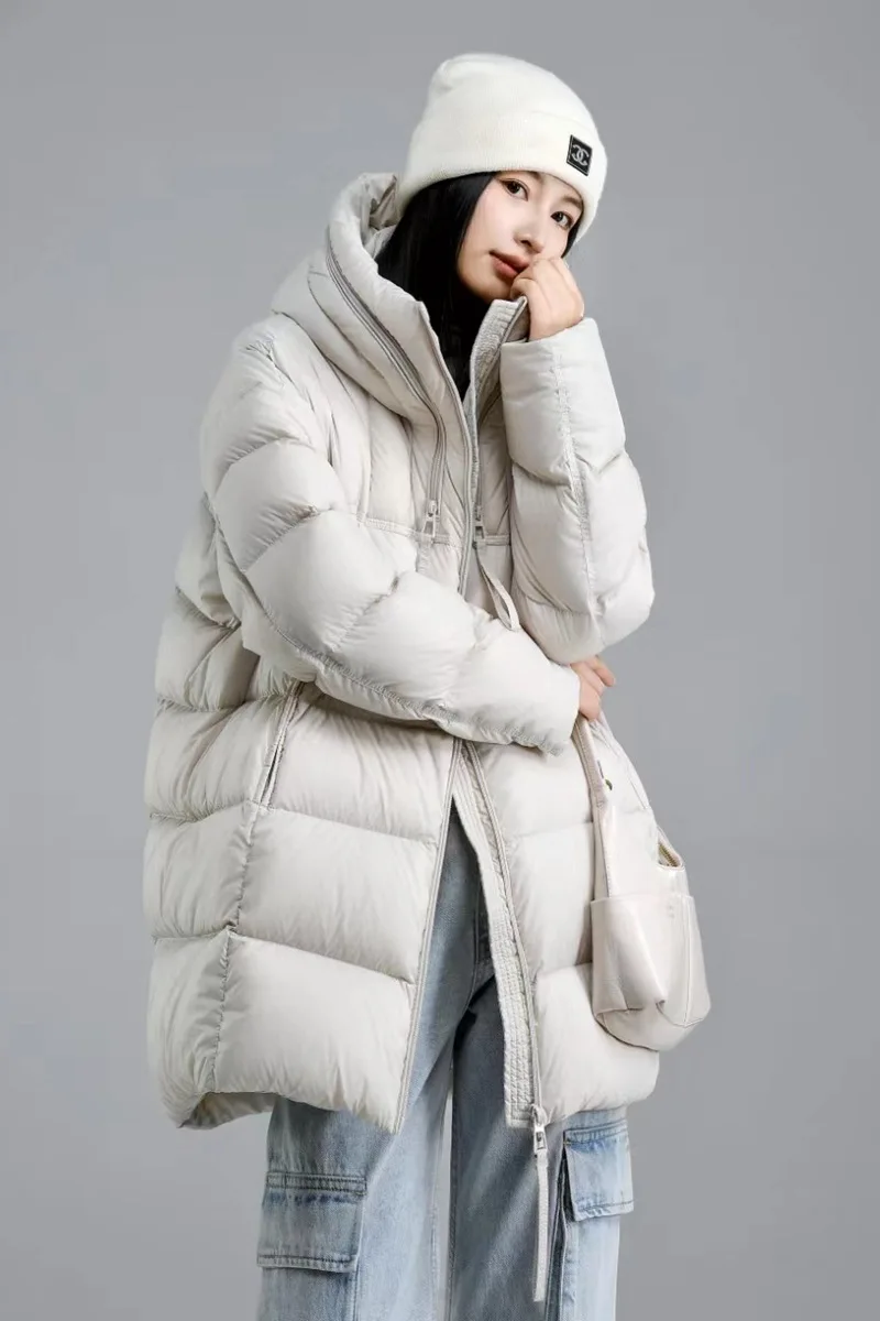 Winter Hooded Warm Mid Length Down Jacket Female Double Zipper Solid Parker Outwears Women 90% White Duck Down Loose Down Jacket